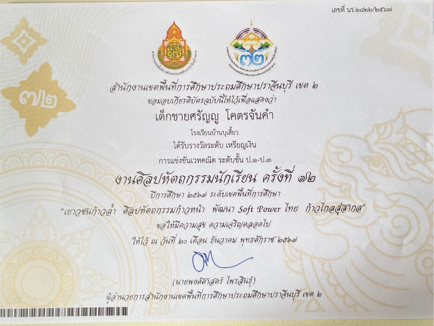 ได้รับรางวัลเหรียญเงิน การแข่งขันเวทคณิต ระดับชัน ป.1-3 งานศิลปหัตถกรรมนักเรียนครั้งที่ 72