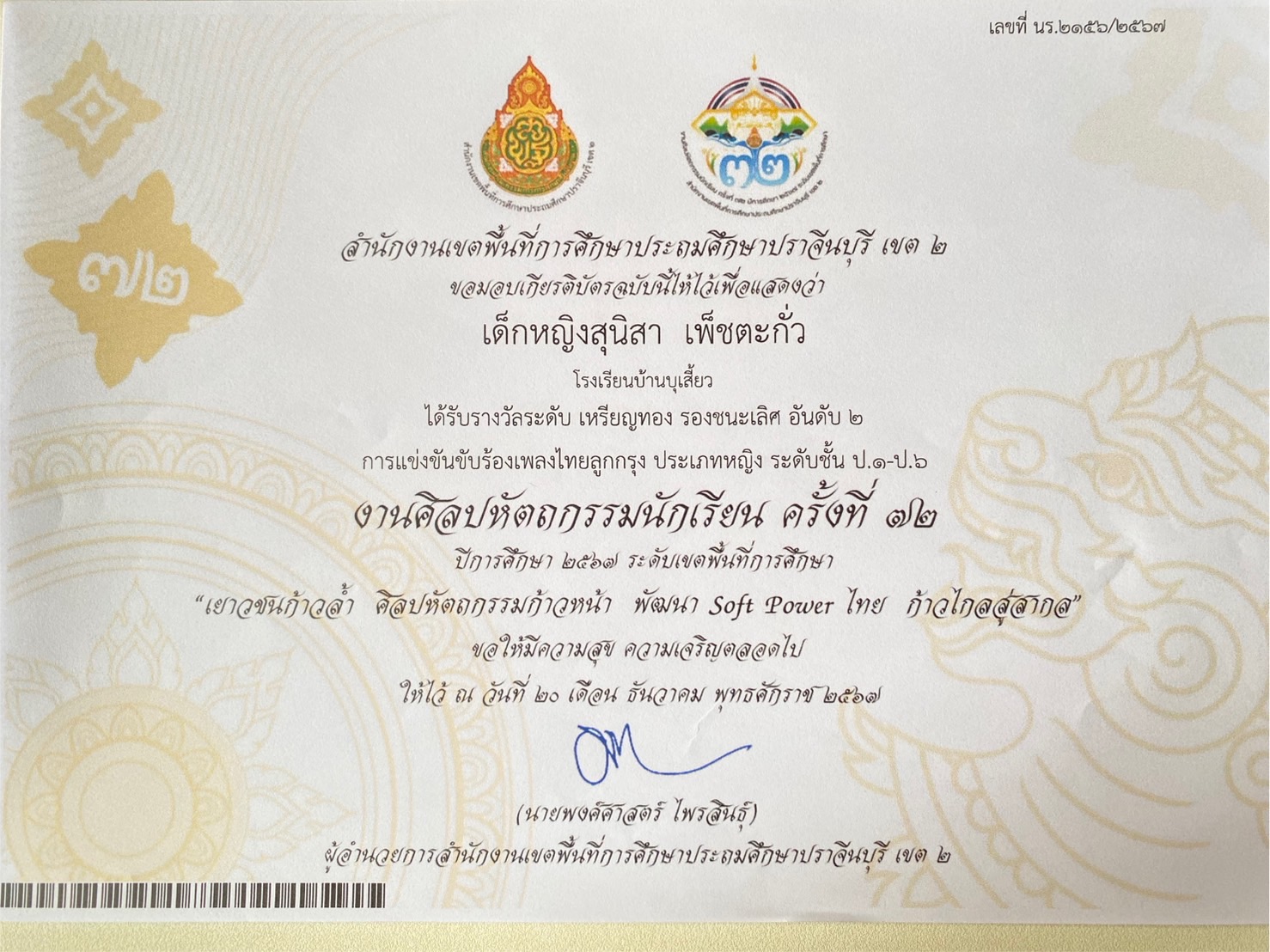 ได้รับรางวัลเหรียญทอง ชนะเลิศอันดับที่ 2 การแข่งขันขับร้องเพลงไทยลูกกรุง ระดับชัน ป.1-6 งานศิลปหัตถกรรมนักเรียนครั้งที่ 72