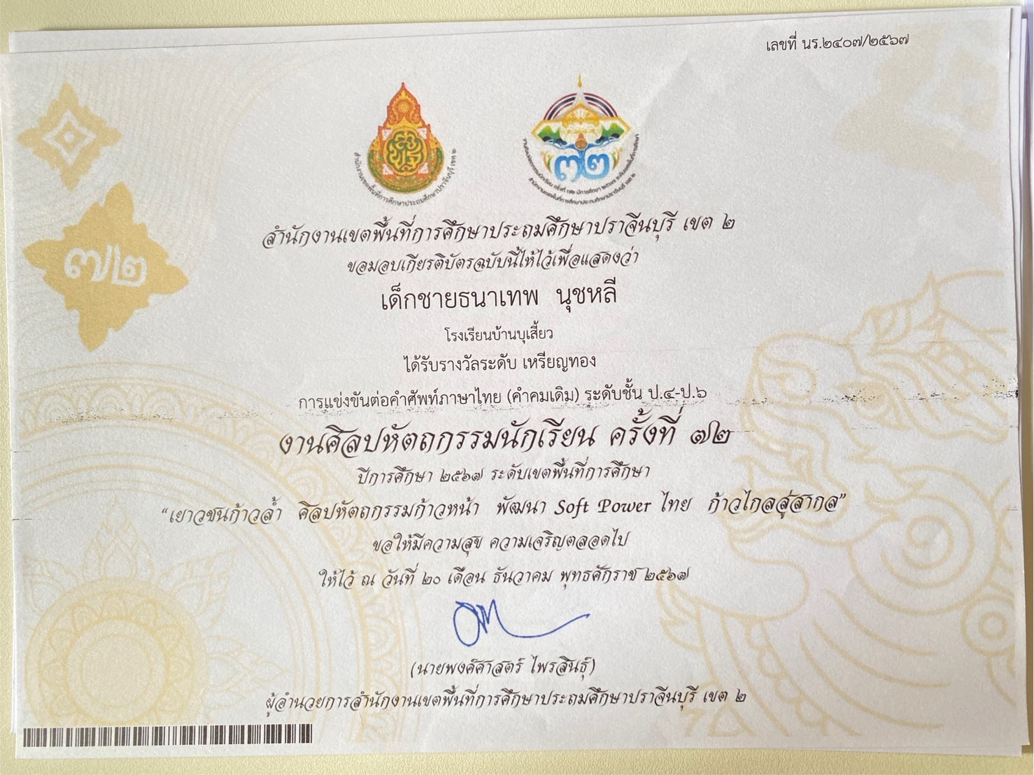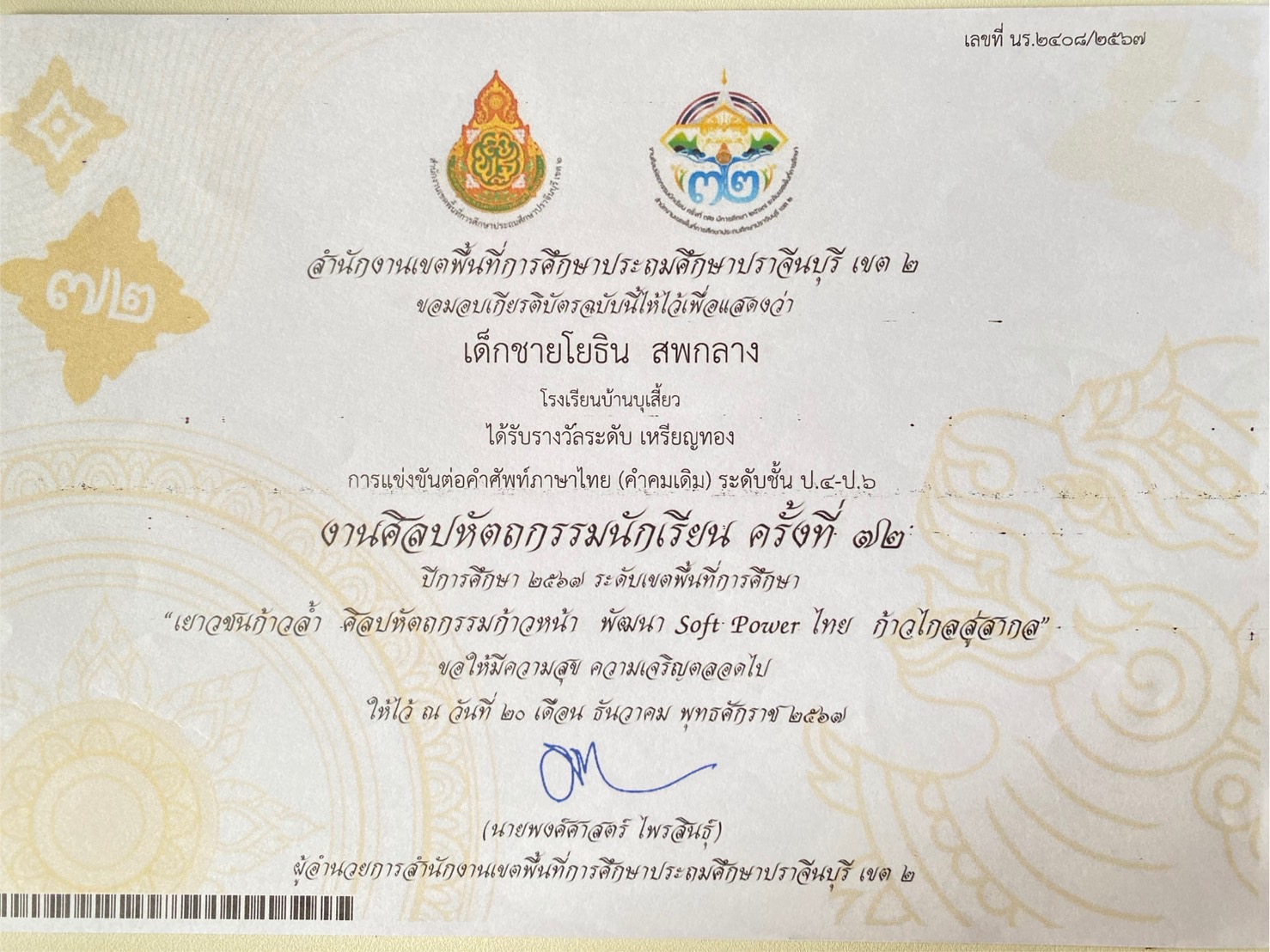 ได้รับรางวัลเหรียญทอง การแข่งขันต่อคำศัพท์ภาษาไทย ระดับชัน ป.4-6 งานศิลปหัตถกรรมนักเรียนครั้งที่ 72